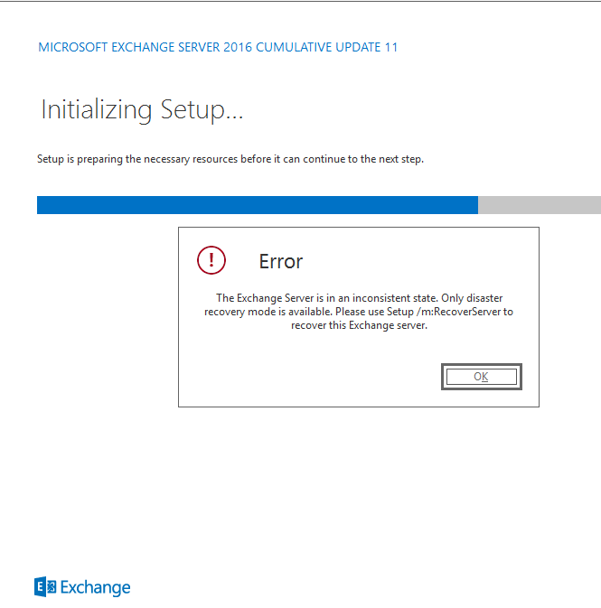 the exchange server is in an incomsistent state. only disaster recovery mode is available. please use setup /m:RecoveryServer to ecover this Exchange Server.